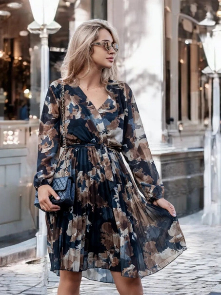 • Ta urocza sukienka midi w kwiaty to kwintesencja kobiecości i elegancji. Prezentuje się wyjątkowo dzięki delikatnemu materiałowi ozdobionemu żywym wzorem kwiatowym. Dekolt w serek pięknie podkreśla linię szyi i dekolt, zapewniając subtelną nutę zmysłowośc