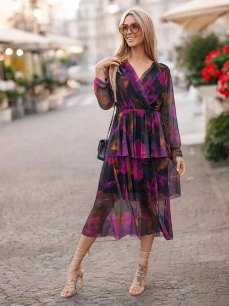 • Ta urocza sukienka midi w kwiaty to kwintesencja kobiecości i elegancji. Prezentuje się wyjątkowo dzięki delikatnemu materiałowi ozdobionemu żywym wzorem kwiatowym. Dekolt w serek pięknie podkreśla linię szyi i dekolt, zapewniając subtelną nutę zmysłowośc