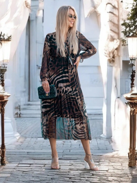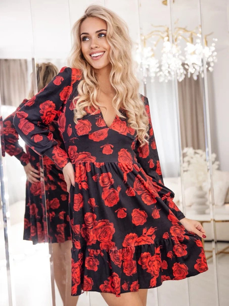 - Ta urocza sukienka midi w kwiaty to kwintesencja kobiecości i elegancji. Prezentuje się wyjątkowo dzięki delikatnemu materiałowi ozdobionemu żywym wzorem kwiatowym. Dekolt w serek pięknie podkreśla linię szyi i dekolt, zapewniając subtelną nutę zmysłowośc