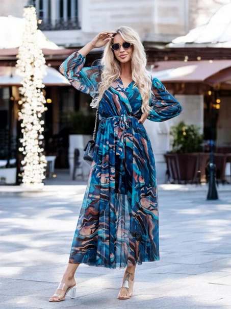 - Ta urocza sukienka midi w kwiaty to kwintesencja kobiecości i elegancji. Prezentuje się wyjątkowo dzięki delikatnemu materiałowi ozdobionemu żywym wzorem kwiatowym. Dekolt w serek pięknie podkreśla linię szyi i dekolt, zapewniając subtelną nutę zmysłowośc