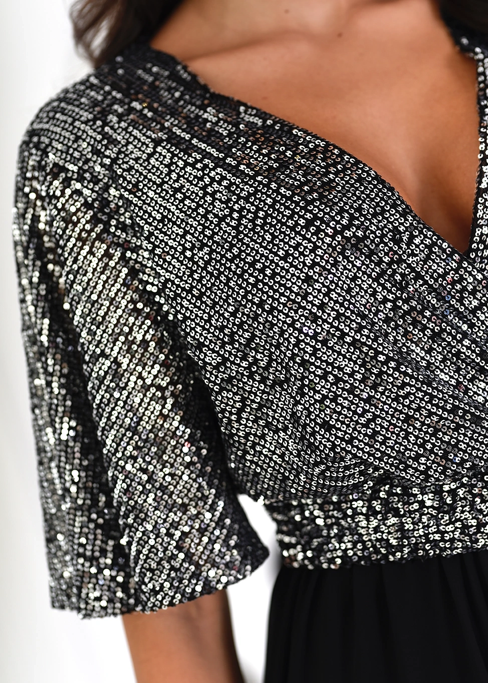 • Ta urocza sukienka midi w kwiaty to kwintesencja kobiecości i elegancji. Prezentuje się wyjątkowo dzięki delikatnemu materiałowi ozdobionemu żywym wzorem kwiatowym. Dekolt w serek pięknie podkreśla linię szyi i dekolt, zapewniając subtelną nutę zmysłowośc