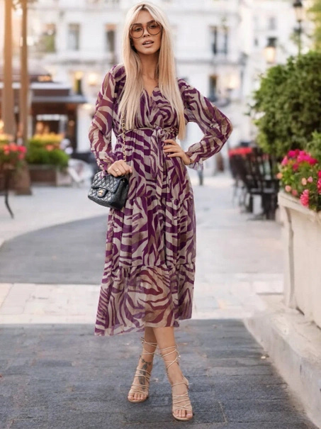 • Ta urocza sukienka midi w kwiaty to kwintesencja kobiecości i elegancji. Prezentuje się wyjątkowo dzięki delikatnemu materiałowi ozdobionemu żywym wzorem kwiatowym. Dekolt w serek pięknie podkreśla linię szyi i dekolt, zapewniając subtelną nutę zmysłowośc