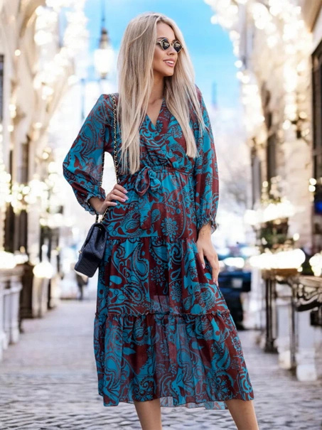• Ta urocza sukienka midi w kwiaty to kwintesencja kobiecości i elegancji. Prezentuje się wyjątkowo dzięki delikatnemu materiałowi ozdobionemu żywym wzorem kwiatowym. Dekolt w serek pięknie podkreśla linię szyi i dekolt, zapewniając subtelną nutę zmysłowośc