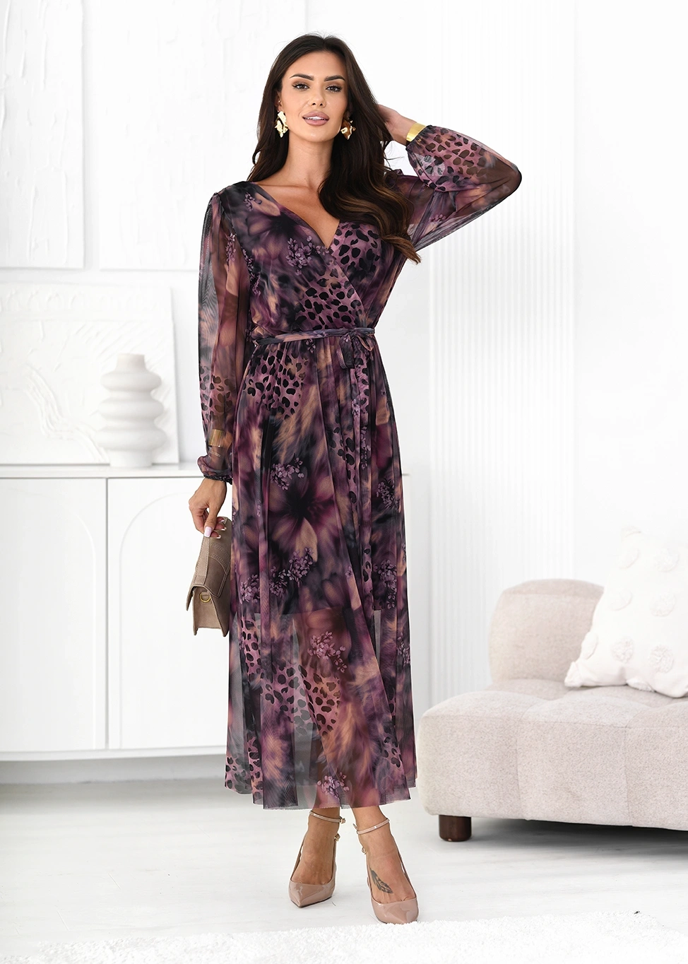 • Ta urocza sukienka midi w kwiaty to kwintesencja kobiecości i elegancji. Prezentuje się wyjątkowo dzięki delikatnemu materiałowi ozdobionemu żywym wzorem kwiatowym. Dekolt w serek pięknie podkreśla linię szyi i dekolt, zapewniając subtelną nutę zmysłowośc