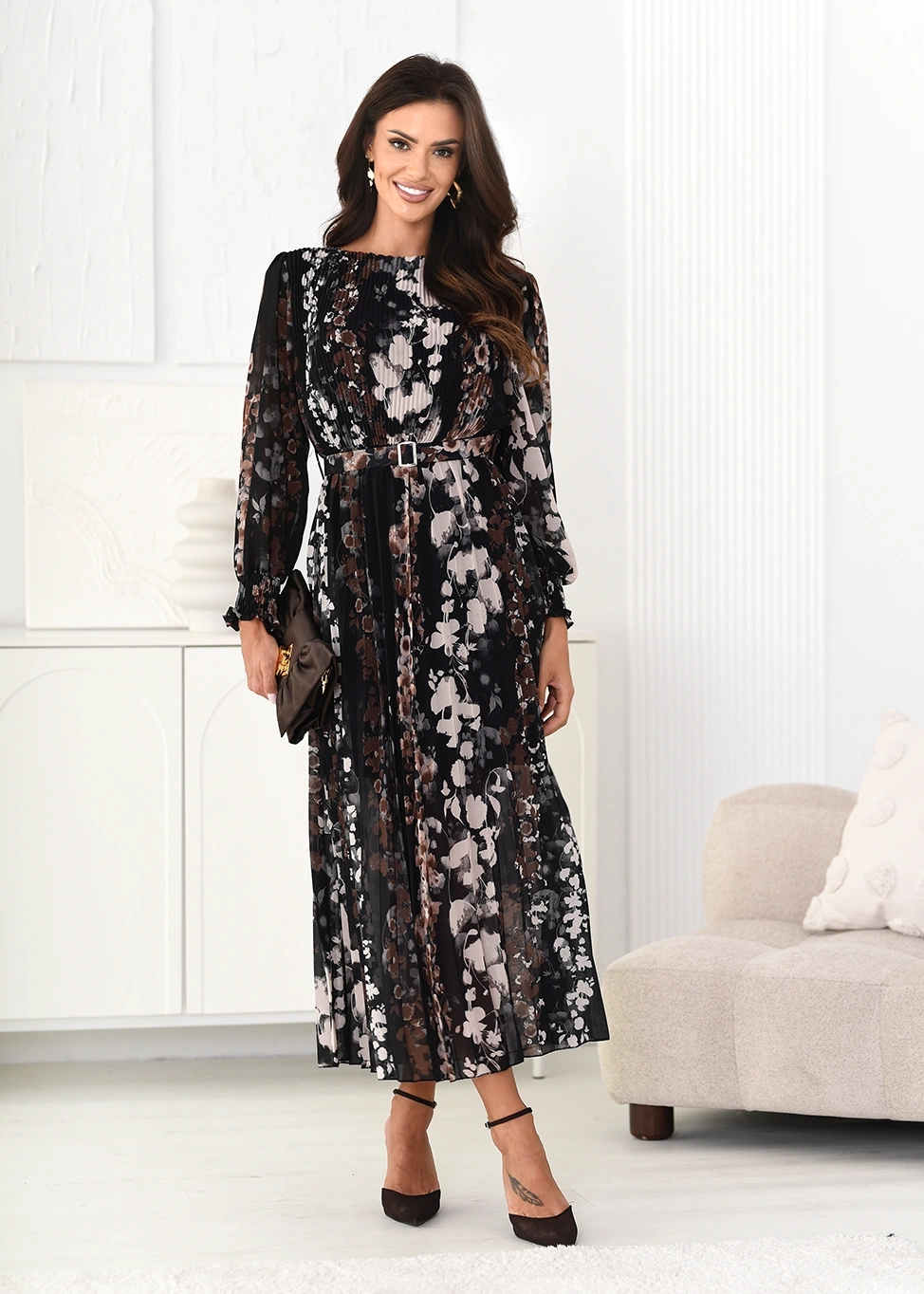 • Ta urocza sukienka midi w kwiaty to kwintesencja kobiecości i elegancji. Prezentuje się wyjątkowo dzięki delikatnemu materiałowi ozdobionemu żywym wzorem kwiatowym. Dekolt w serek pięknie podkreśla linię szyi i dekolt, zapewniając subtelną nutę zmysłowośc