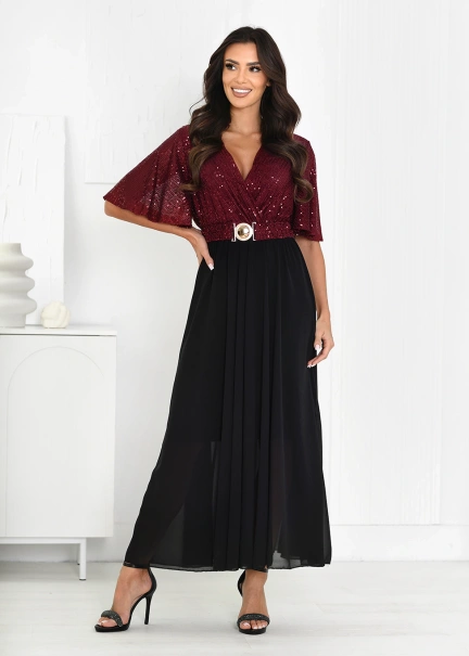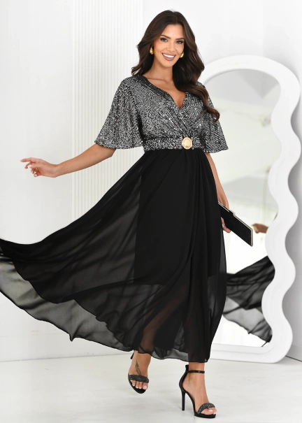 Kolejną propozycją od Lawitomoda na unikatową, czarną sukienkę na Sylwestra jest długa sukienka z transparentym dołem Luna dostępna w hurtowych cenach. To kreacja z długimi, również transparentnymi rękawami. Posiada dekolt w serek nie tylko z przodu, ale również na plecach, co dodaje jej kobiecości. Dzięki długiemu, transparentnemu dołowi idealnie nadaje się dla kobiet lubiących szpilki. Sukienka jest wykonana z tkaniny ozdobionej niewielkimi kryształkami, które będą pięknie połyskiwać w sylwestrowym oświetleniu.