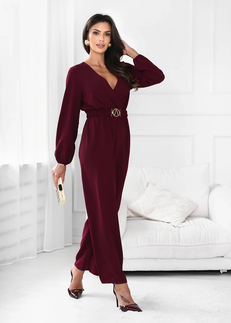 - Piękny kombinezon z marszczonym paskiem w talii, łączący klasyczny styl z nowoczesnym krojem. Szerokie nogawki oraz luźne długie rękawy czynią go komfortowym w noszeniu podczas chłodniejszych dni.