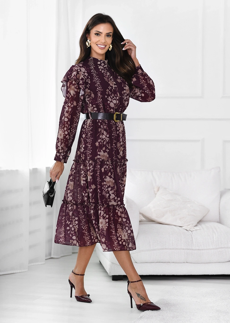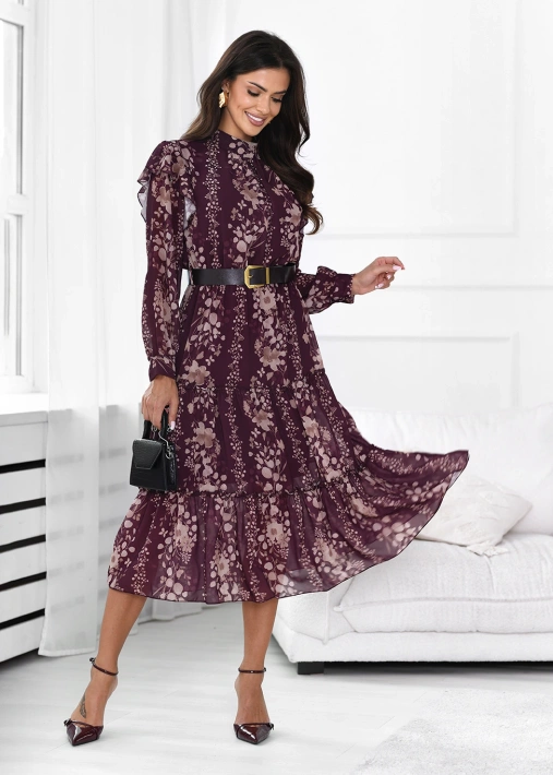- Wzorzysta sukienka midi z długim rękawem i paskiem w talii . Posiada elegancką stójkę przy szyi, talię oraz dół zakończony falbankami.