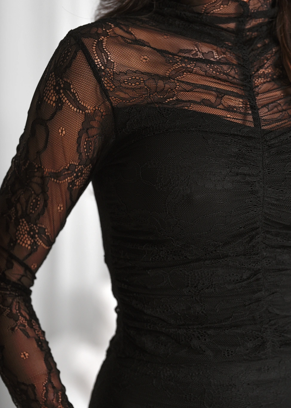 - Elegancki komplet - połączenie bluzki z transparentnymi elementami oraz długiej, dopasowanej spódnicy. Wykonany z lekkiego, koronkowego materiału. Idealny zestaw na wieczorne wyjścia.