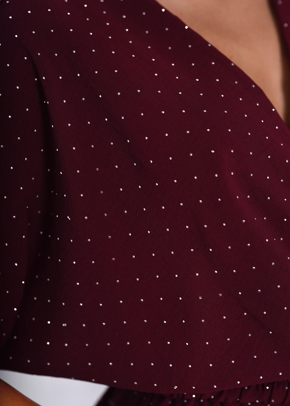 • Krótka sukienka z krótkim rękawem wykonana z pięknie błyszczącej tkaniny. Posiada głęboki dekolt i pasek w talii. Idealna na wieczorne wyjścia.
