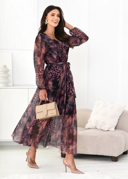 • Plisowana sukienka midi z długim rękawem zdobiona grochami. Posiada dekolt w serek i pasek, który pięknie podkreśla talię.