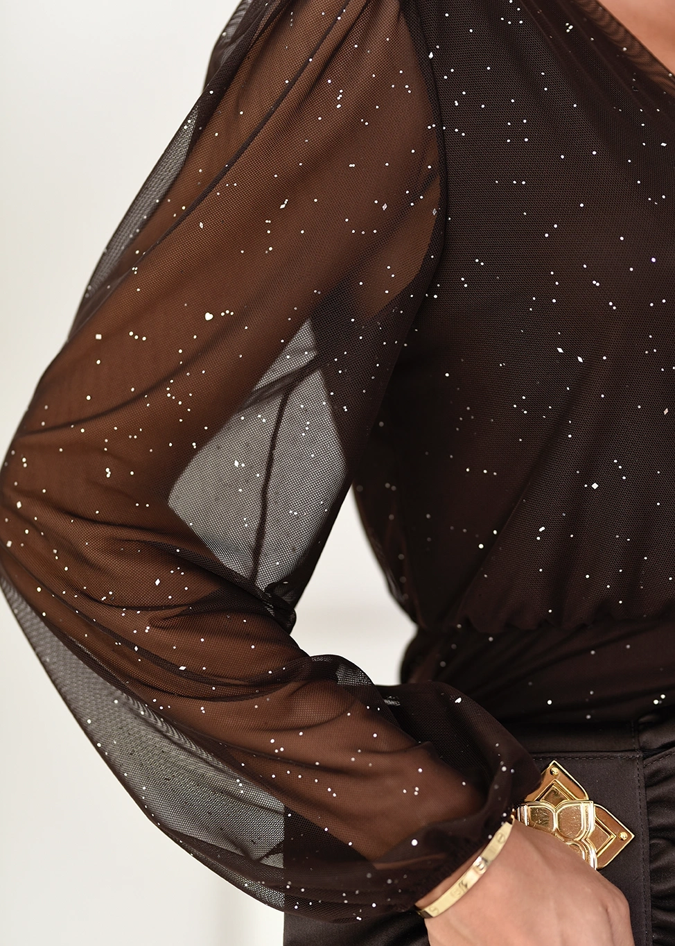 - Zmysłowa, połyskująca sukienka z drapowaniami i głębokim dekoltem, idealna na eleganckie wyjścia. Długie, lekko prześwitujące rękawy dodają powabu.