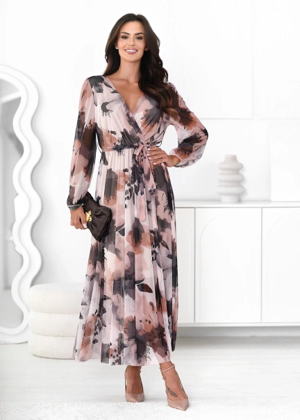 - Elegancka sukienka z długimi, transparentnymi rękawami i marszczeniem. Posiada głęboki dekolt z przodu i z tyłu. Idealna na wieczorne wyjścia.