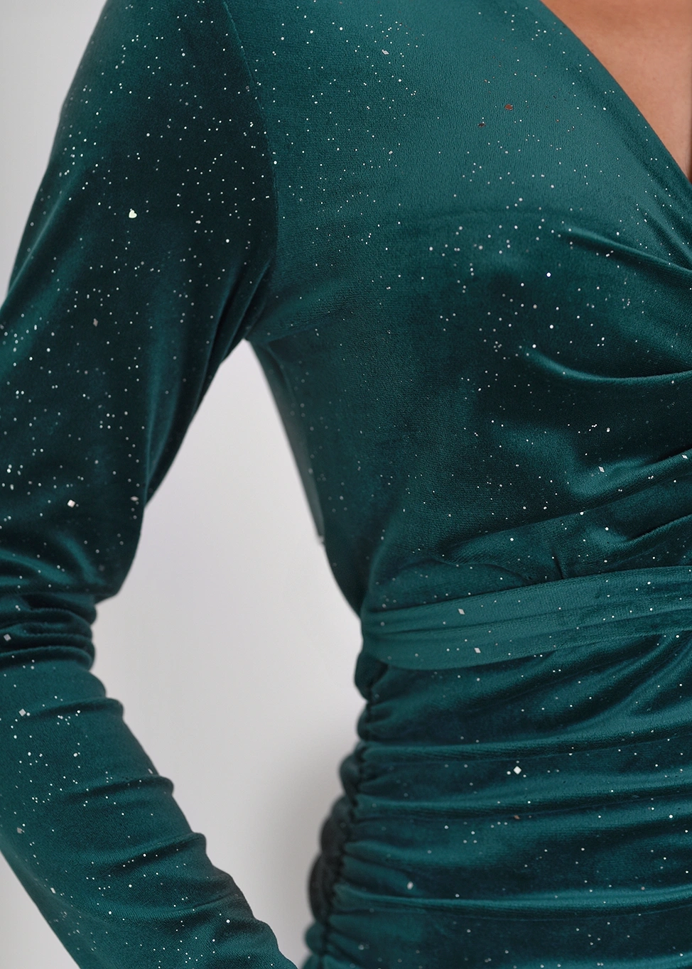 • Welurowa, brokatowa sukienka z długimi rękawami i marszczeniem. Posiada głęboki dekolt i wiązanie w pasie. Idealna na wieczorne wyjścia.
