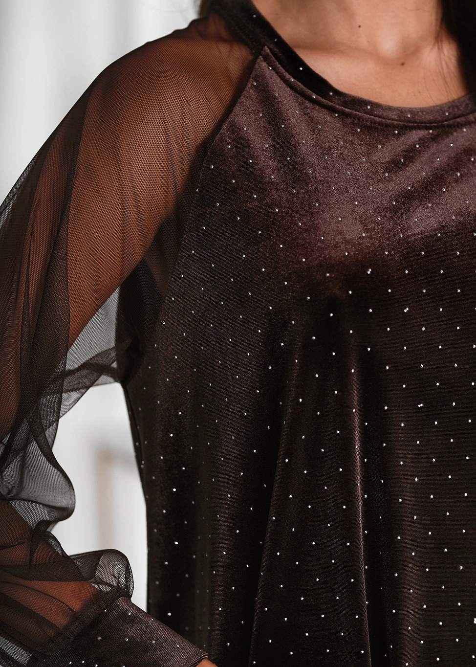 - Połyskująca sukienka o luźniejszym kroju, wykonana z cienkiego weluru. Posiada dekolt w serek i transparentne rękawy 3/4.